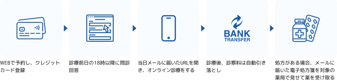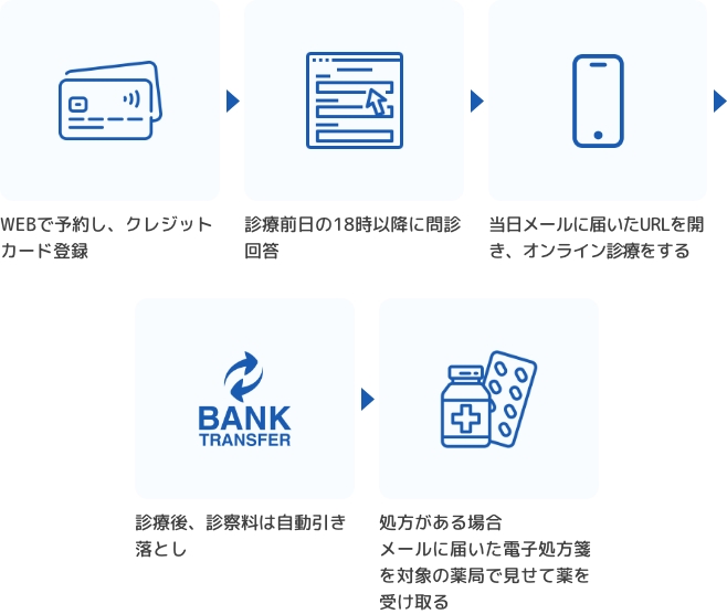 生活習慣病の継続的な診察、男性型脱毛治療、禁煙治療等、来院が難しい方にも安心してご利用いただけます。